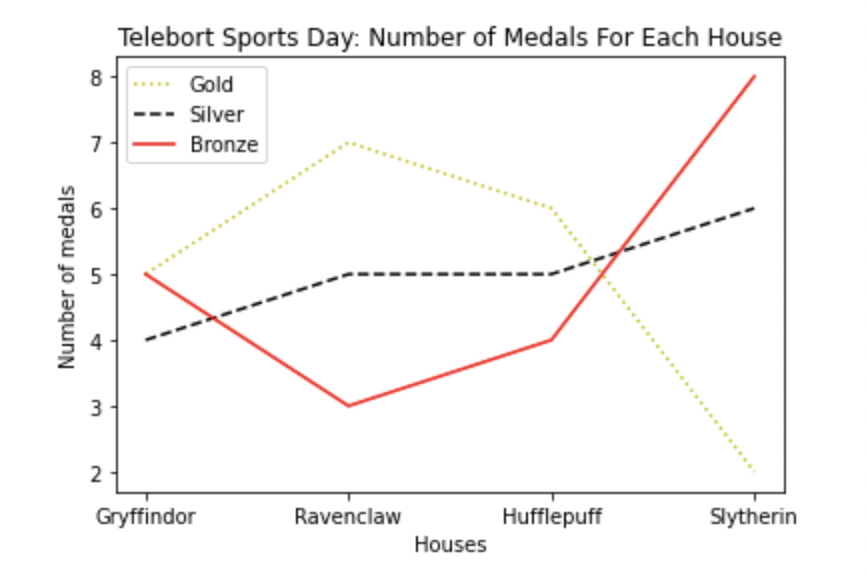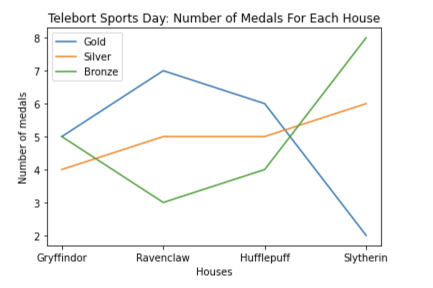 Let's create a line graph showing the medals won by each Hogwarts house!