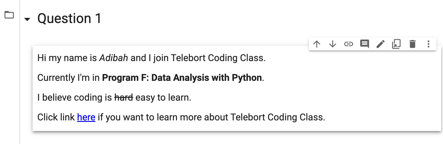 print("What is your name?" + name) print("What is your age?" + age) print("What is your school?" + school) print("Hi, " + name + ". You are " + age + " years old from " + school)